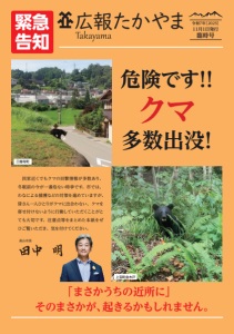 広報たかやま令和7年[2025] 11月1日発行 臨時号 緊急 告知 「まさかうちの近所に」 そのまさかが、起きるかもしれません。 危険です! クマ 多数出没! 三福寺町 上宝町金木戸 民家近くでもクマの目撃情報が多数あり、 冬眠前の今が一番危ない時季です。市では、 わなによる捕獲などの対策を進めていますが、 皆さん一人ひとりがクマに出合わない、クマを 寄せ付けないように行動していただくことがと ても大切です。注意点等をまとめた本紙をぜ ひご覧いただき、気を付けてください。 高山市長