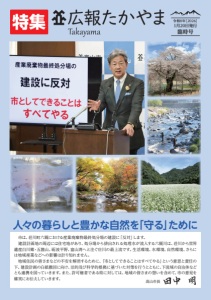 広報たかやま 特集 令和8年[2026] 1月20日発行 臨時号 人々の暮らしと豊かな自然を「守る」ために 市は、荘川町六厩における産業廃棄物最終処分場の建設に「反対」します。 建設計画地の周辺には住宅地があり、処分場から排出される処理水が流入する六厩川は、荘川から世界 遺産白川郷・五箇山、砺波平野、富山湾へと注ぐ庄川の最上流です。生活環境、水環境、自然環境、さらに は地域産業などへの影響は計り知れません。 地域住民の皆さまなどの不安を解消するために、「市としてできることはすべてやる」という意思と責任の 下、建設計画の白紙撤回に向け、法的及び科学的根拠に基づいた対策を行うとともに、下流域の自治体など とも連携を図っていきます。また、許可権者である県に対しては、地域の皆さまの想いを含めて、市の意見を 確実にお伝えしていきます。 高山市長